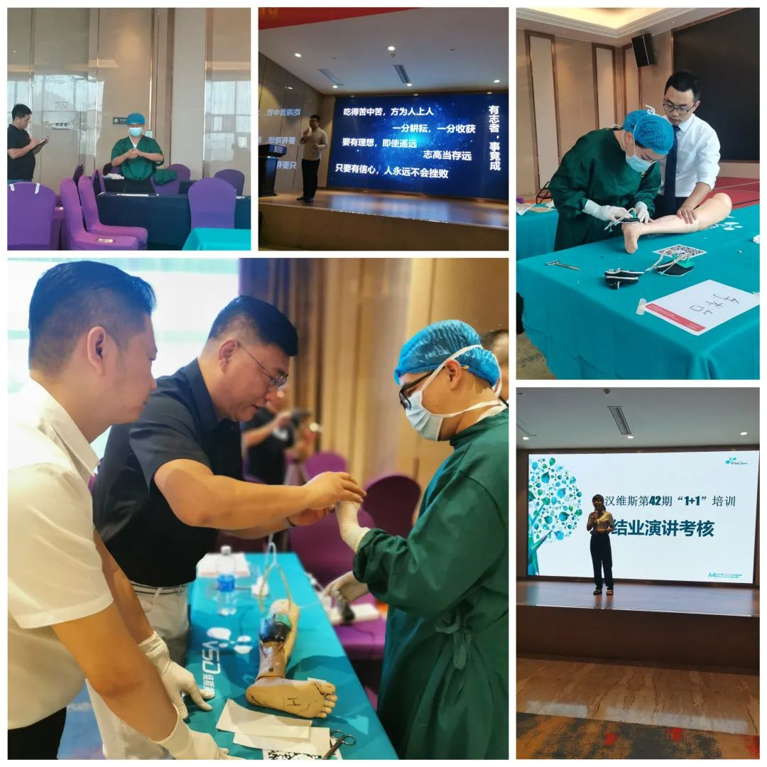 “1+1”培训是宋九宏董事长开创的培训模式,整个培训历经整整一周,内容涵盖了企业文化及战略、参观工厂车间及展厅、产品知识学习与考试、模拟手术实操训练与考试、拓展训练、公司制度、商务演讲技能提升课程、经销商学员观看汉秀表演、夜游长江,共9个模块。参训学员们每天8点开始上课,晚上9、10点才结束,虽忙碌,但充实,因为收获满满。